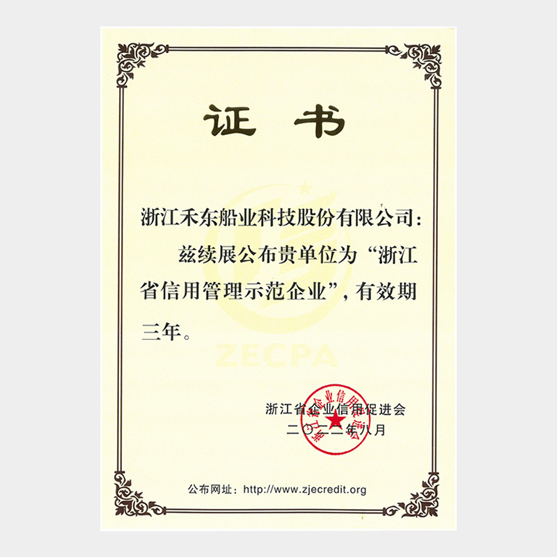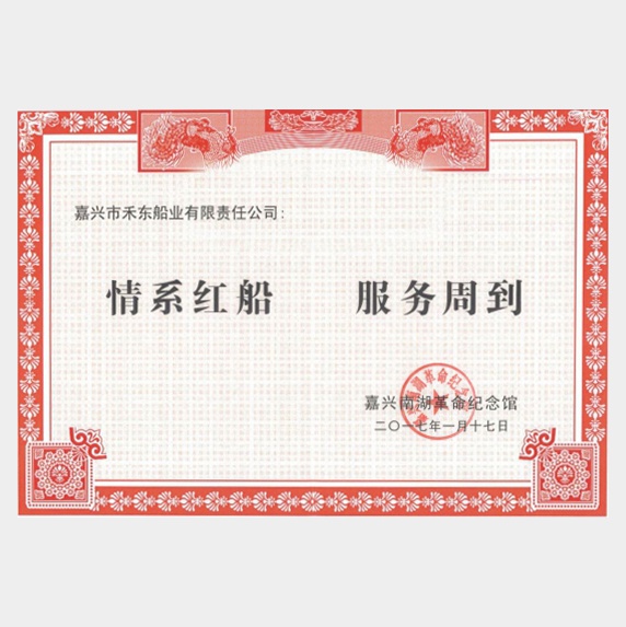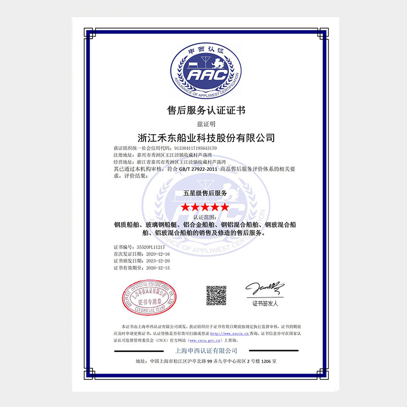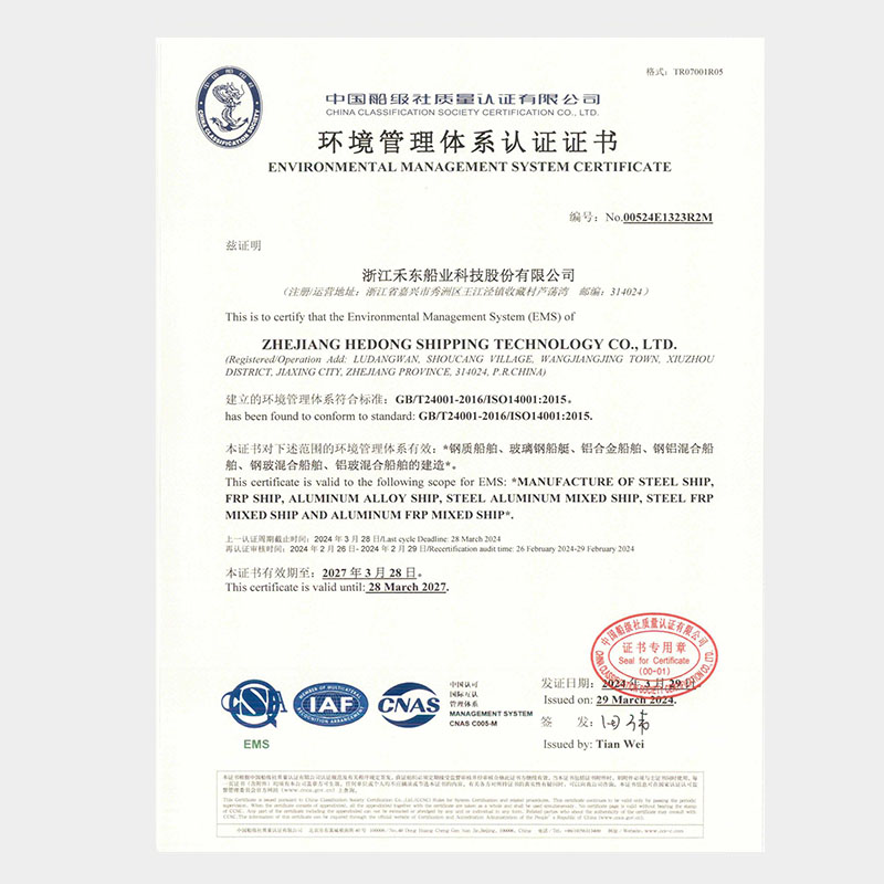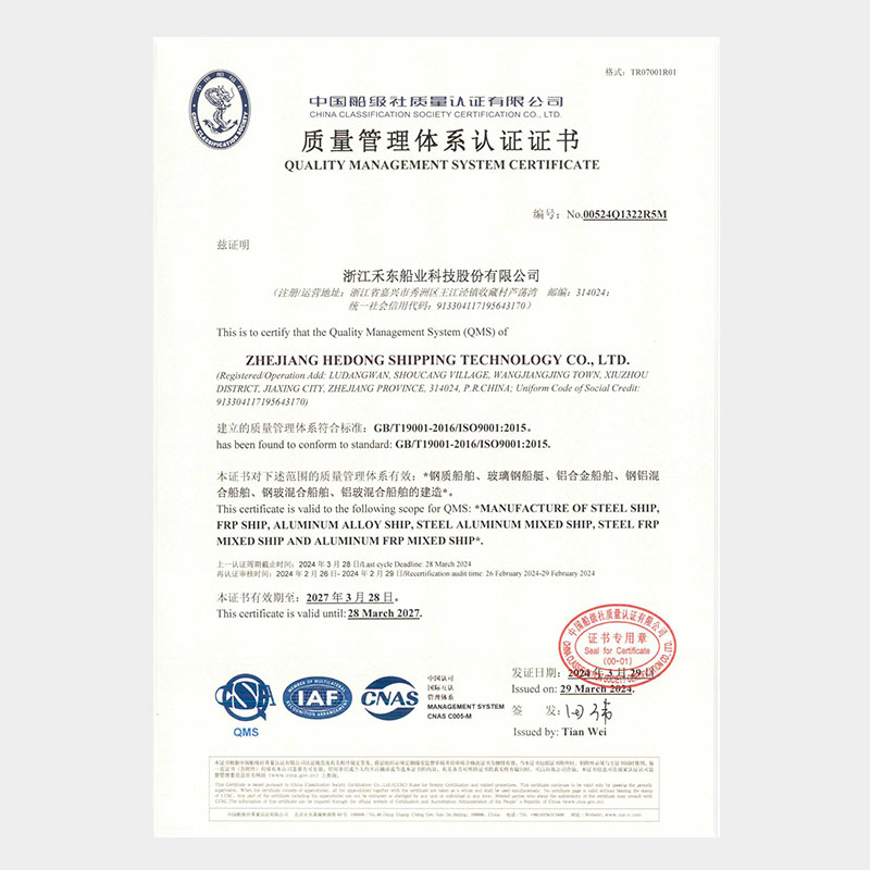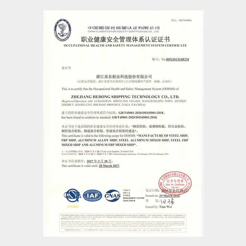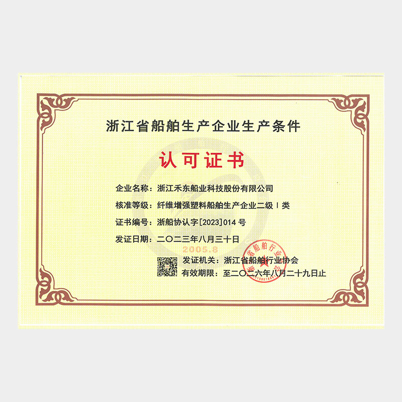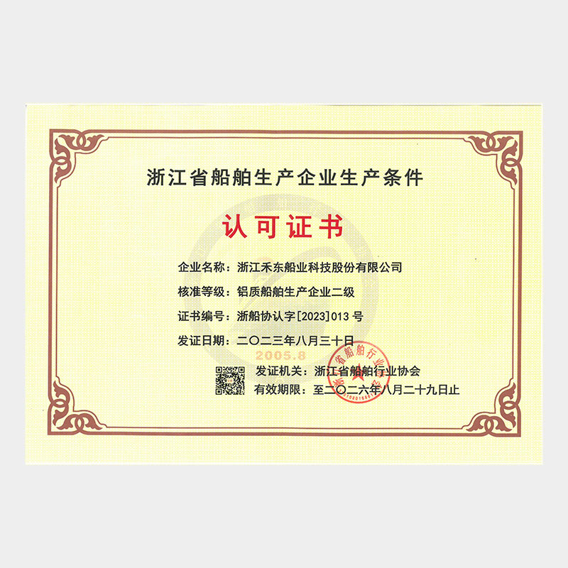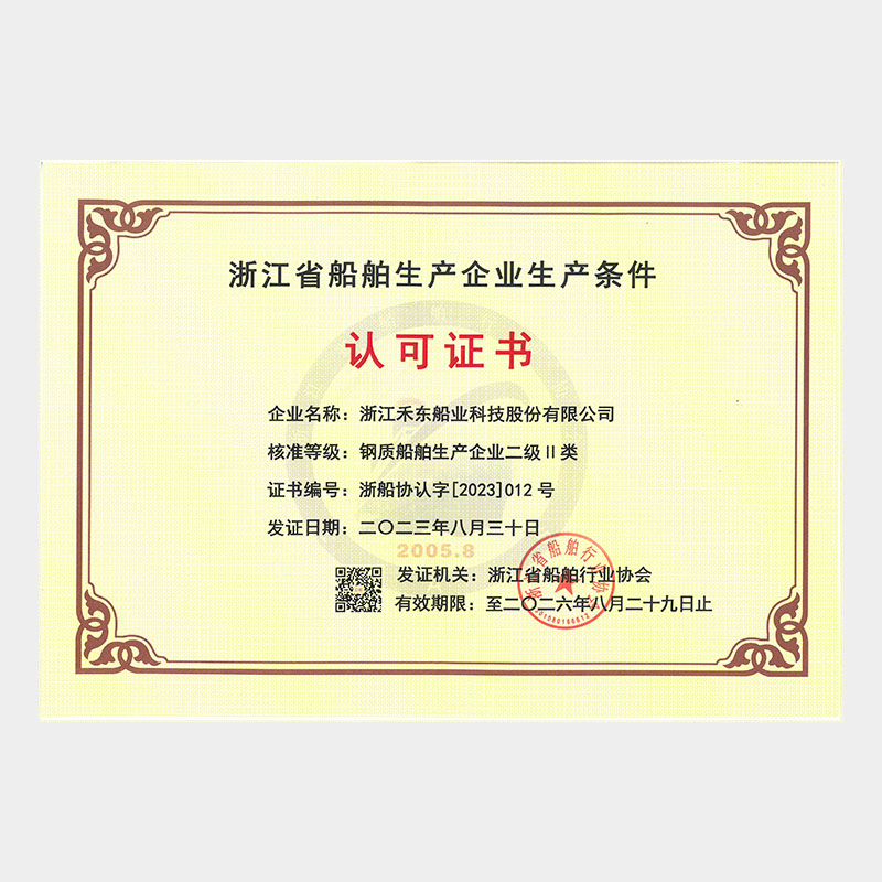 公司具備鋼質(zhì)船舶制造企業(yè)二級∥類、鋁質(zhì)船舶制造企業(yè)三級和纖維增強塑料船舶制造企業(yè)二級類資質(zhì),擁有中國船級社認證公司認證的IS09001質(zhì)量管理體系、ISO14001 環(huán)境管理體系認證證書和OHSAS18001職業(yè)健康安全管理體系和按照國家相關(guān)標(biāo)準(zhǔn)建立的安全生產(chǎn)標(biāo)準(zhǔn)化三級體系。
